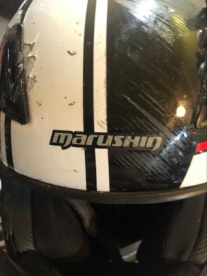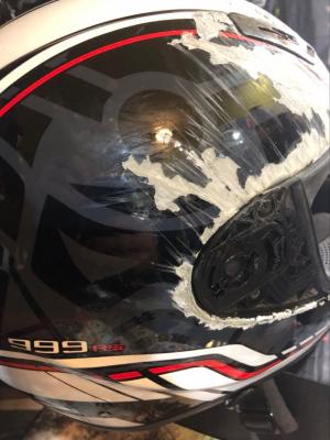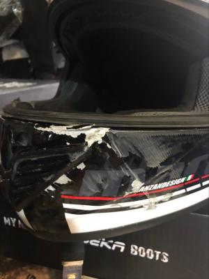 Elmesélte ahogyan a képeken látható durva balesetet elszenvedte. Egy teherautós fordult elé és már nem volt lehetősége elkerülni az ütközést. Körülbelül 70km/ órával csapódott a teherautó oldalának, ennek a nyomait viseli a sisak bal oldala, majd kb.húsz métert repülve, az aszfaltra érkezett. A sisak tökéletesen teljesített, semmi sérülés nem történt a fején, pedig a jobb oldala is megszenvedte a sisaknak az aszfalthoz csapódást és a csúszást!
